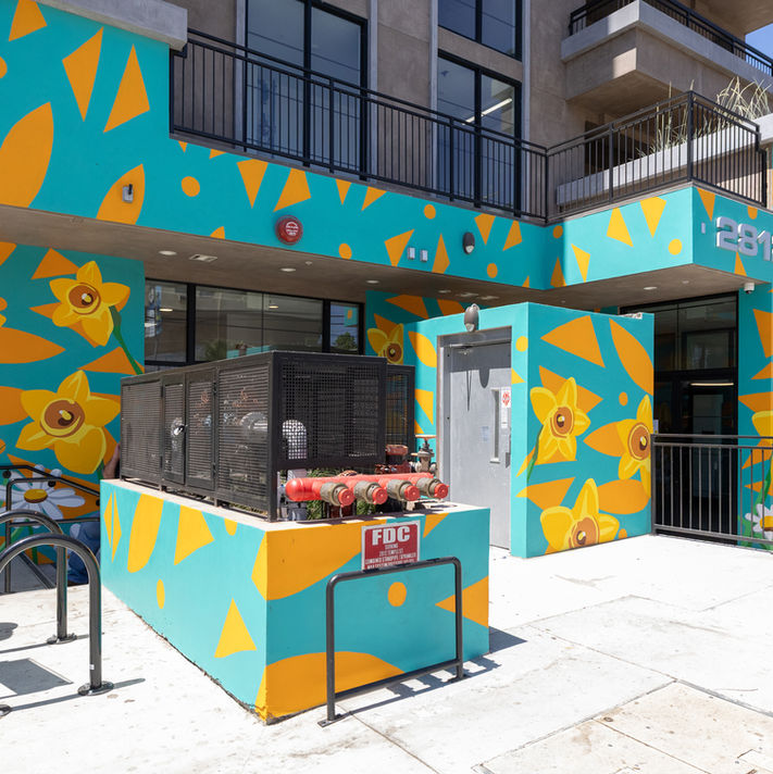 I am depicting various subjects in the mural, including Narcissus flowers and mandala geometry. The Narcissus flowers are symbolic and known to represent new beginnings. By using a flower that symbolizes new beginnings, the mural captures not only Brilliant Corners' commitment as developers and property providers for the people we serve but also signifies the fresh start for those who will reside in the building. It reflects the teamwork culture that Brilliant Corners fosters internally among staff and across departments. Lastly, the mandala geometry used in the mural is a signature element of my artwork, serving to provide harmony and balance in the content of my work. On another note, the selection of colors represents the Brilliant Corners logo.